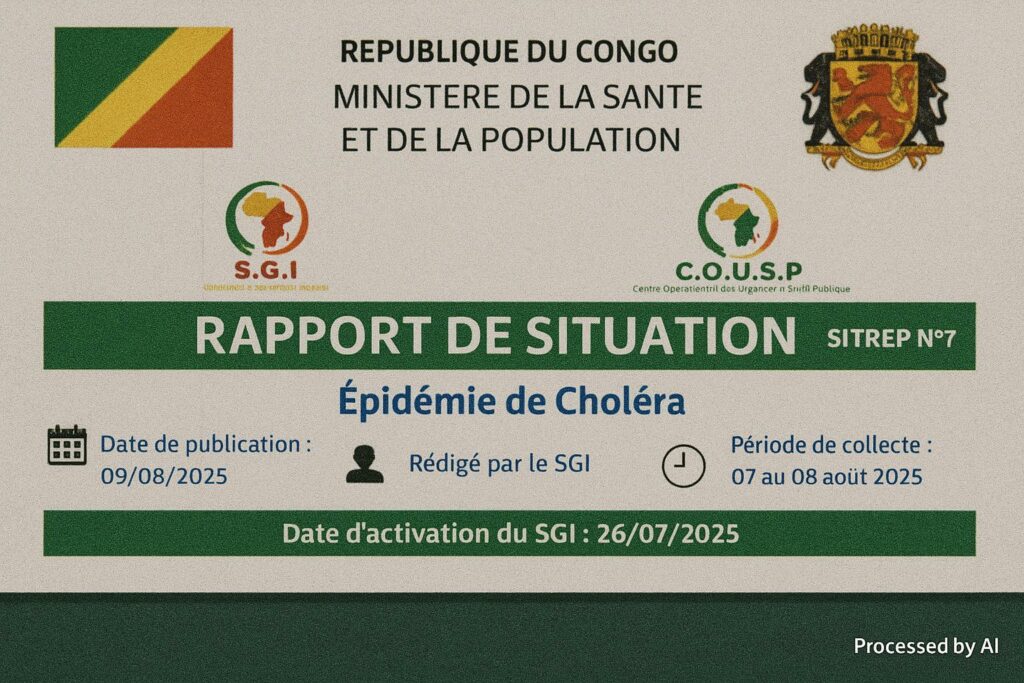 The seventh situation report issued on 9 August 2025 records 1 128 suspected cholera cases and 32 fatalities since the index alert in Makoua six weeks earlier. While the absolute figures remain below the peaks of the 2009 and 2017 outbreaks, the geographic diffusion—stretching from the Ogooué basin to peri-urban Brazzaville—places new pressure on the surveillance grid maintained by the Ministry of Health and Population.