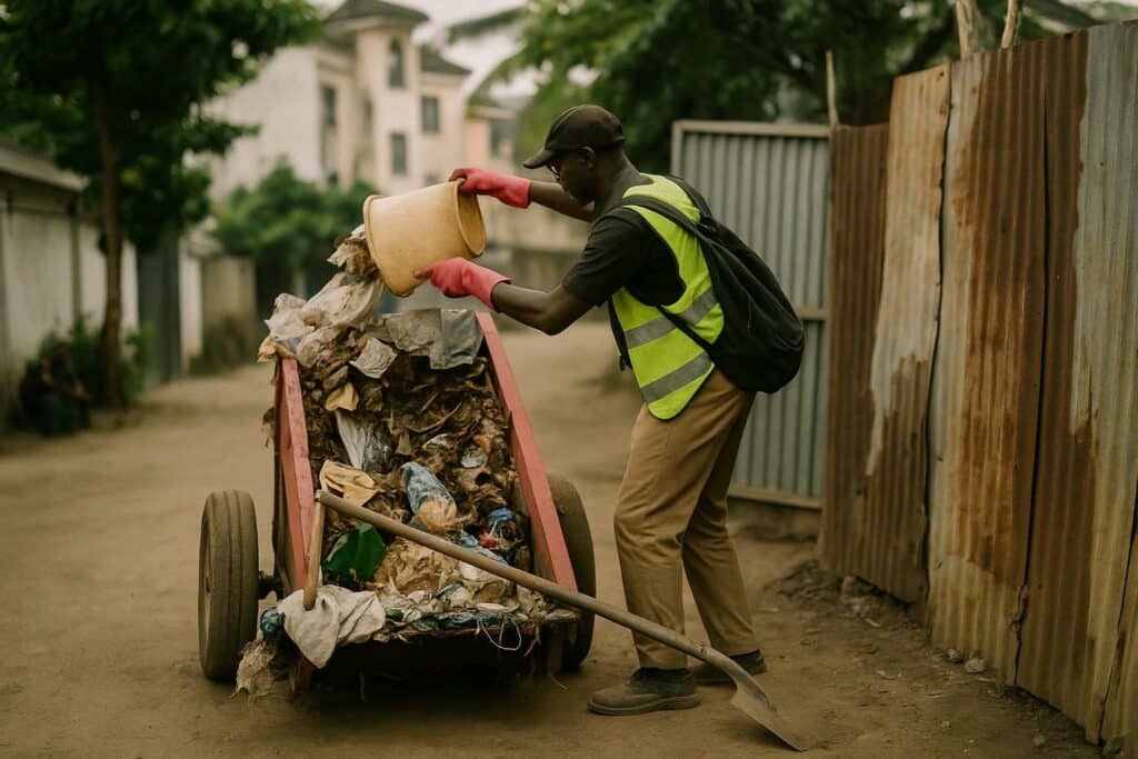 Well before dawn, improvised caravans of hand-pushed carts, wheelbarrows and repurposed plastic basins begin zig-zagging through Poto-Poto, Diata and Mfilou. Chanting distinctive calls such as “La voirie eleki”, the pre-collectors retrieve tightly knotted refuse bags left at courtyard gates for a modest fee of 100 to 200 FCFA. The practice took shape in the early 2010s when conventional concessionaires—today led by Albayrak Waste Management Company—struggled to access the maze of unpaved alleys that characterise much of the capital. According to the Ministry of Urban Planning, close to 35 per cent of Brazzaville’s households now rely primarily on these micro-operators for first-mile removal (Ministère de l’Aménagement de la Ville, 2023).